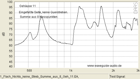 Zu oben, check this out: die Peaks bei rund 610Hz, 1.140Hz, 1.750Hz und 2.200Hz stehen offenbar in Beziehung zu den Gehäuse-Innenmaßen mit Breite 15cm, Höhe 15cm und der Gehäusetiefe 28cm. Die Peaks entstehen also durch so genannte Stehende Wellen. Und sind keine imaginären Platten-Resonanzen.