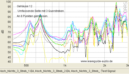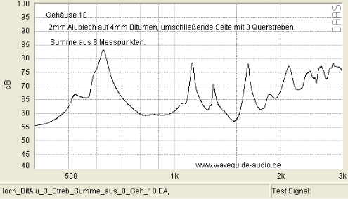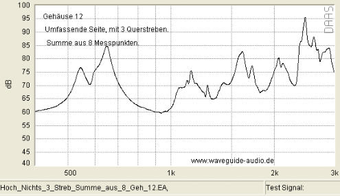Gelegentlich wird im Internet bezüglich ausgesteiften Gehäusen vermutet, gehofft oder befürchtet, damit würden Vibrationen in einen höher frequenten Bereich verschoben. Was je nach Sichtweise wünschenswert, oder besonders schlimm wäre. Der Vergleich unten (bei dem ist keine Dämmwolle im Spiel) weist (bis auf kleine Ausnahmen bei 2.500Hz) nicht darauf hin: