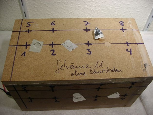 Zwischen den Messpunkten wurden nach und nach Rundstreben eingeleimt (die durch die Gehäusewände hindurch gehen um guten Kraftschluss zu erreichen). Und anschließend wurde neu gemessen. Der Sensor wurde dabei notfalls etwas versetzt, so dass er nicht auf einer Strebe messen würde.