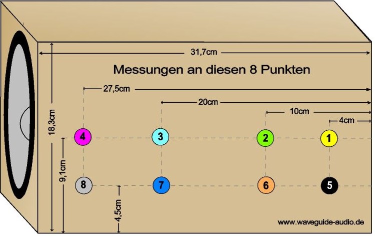 Das zum Messen verwendete Gehäuse (mit 19mm Wandstärke) hat die unten gezeigten Dimensionen. Auch eingezeichnet die 8 Stück Messpunkte, deren Farben sich mit den Farben in den Kurvenscharen decken.